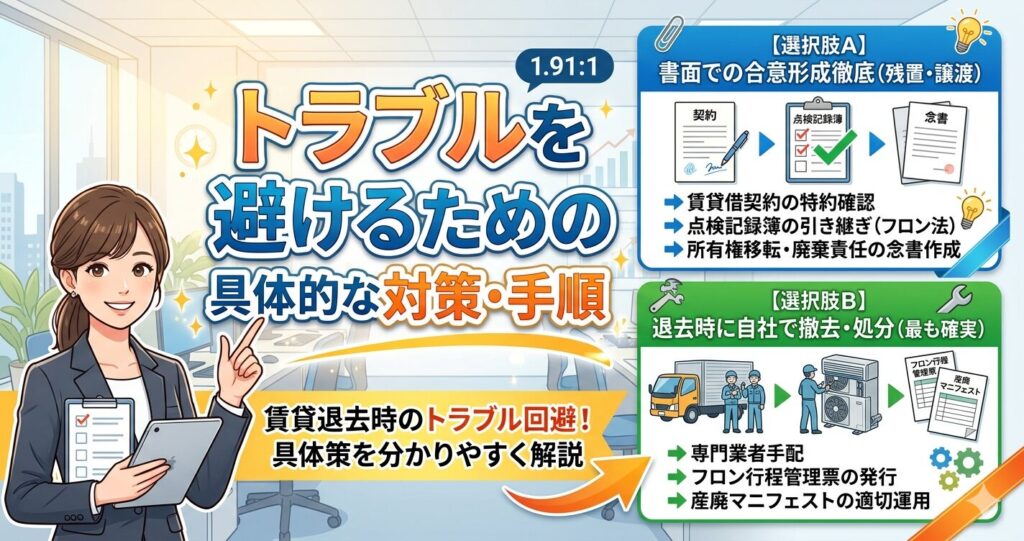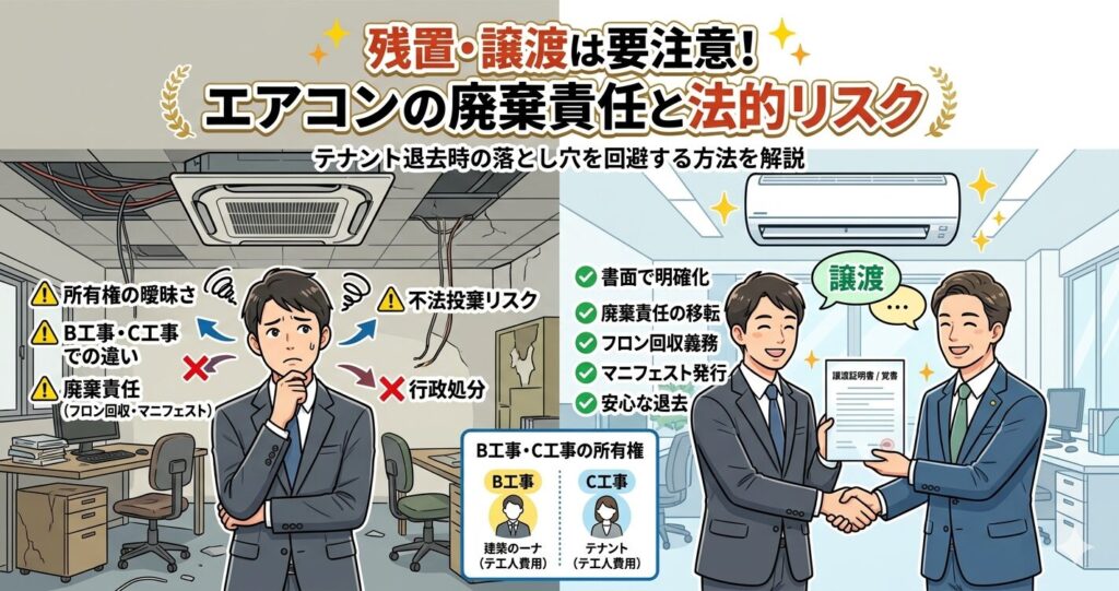 業務用エアコンの残置は、目先のコストを抑えられる一方で、見えない法的リスクを抱え込む側面もあります。