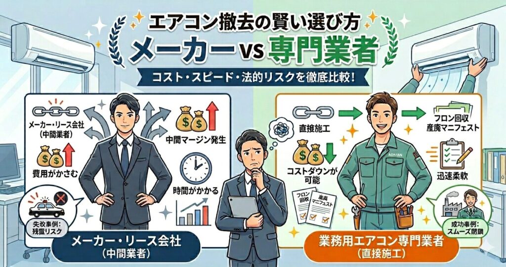 | 比較項目 | メーカー・リース会社・工務店経由 | 業務用エアコン専門業者(当社など) |