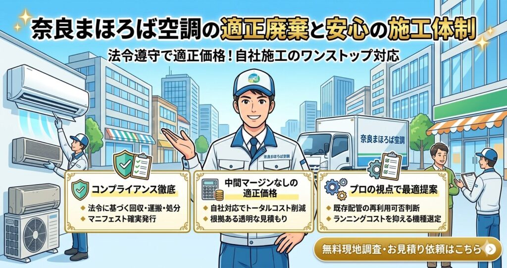 奈良まほろば空調では、法令遵守の適正廃棄と、中間マージンを省いた適正価格での入替工事をワンストップで提供します。