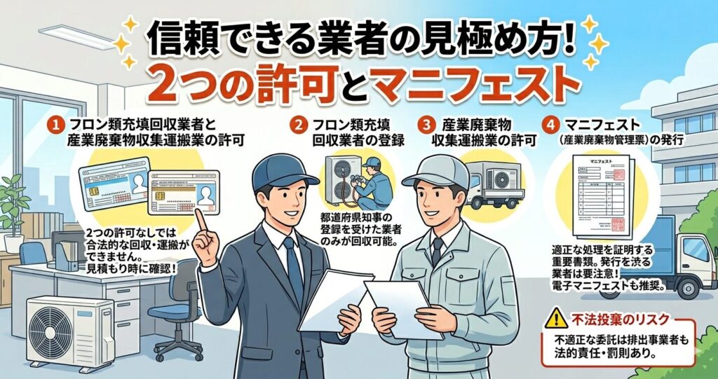 依頼する業者がフロン類充填回収業者産業廃棄物収集運搬業の許可を持ち、確実にマニフェストを発行できるかを確認してください。