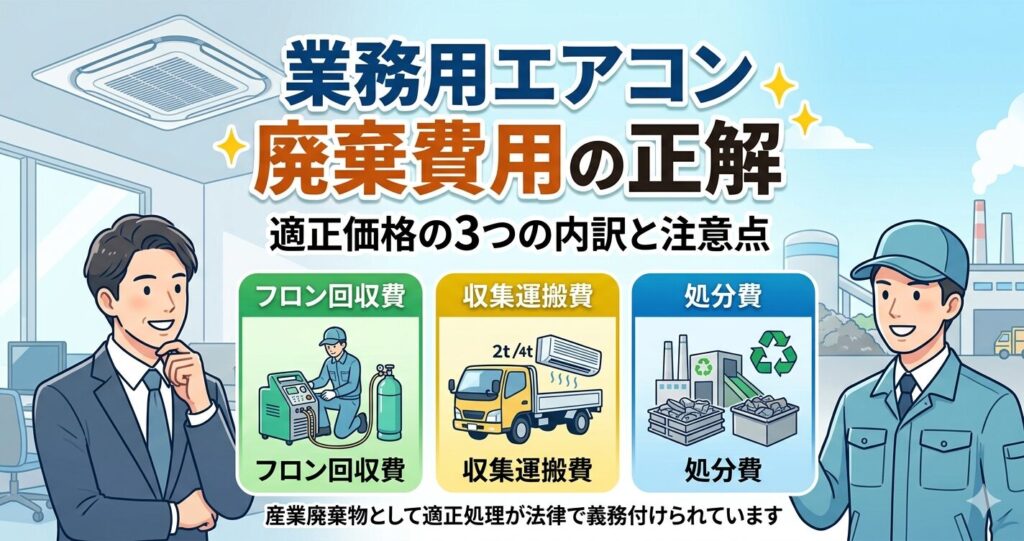 奈良まほろば空調 | 創業50年・奈良密着の空調設備 > 奈良のエアコンお役立ち情報 > フロン排出抑制法点検 > 業務用エアコン廃棄コストとコンプライアンスの両立!不法投棄を防ぐ適正業者の見極め方