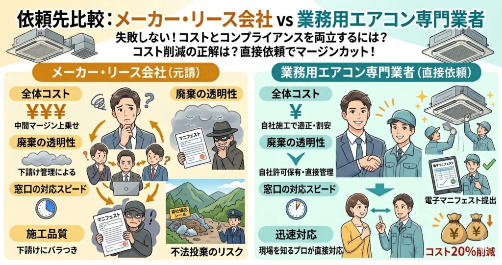 依頼先比較:メーカー・リース会社 vs 業務用エアコン専門業者