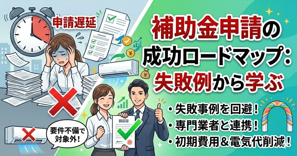 - 要件不備で対象外に:導入するエアコンの省エネ基準が助成金の規定にわずかに満たず、工事完了後に補助金が下りないことが判明した。