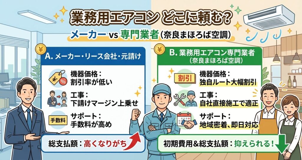| 比較項目 | メーカー・リース会社・元請け | 業務用エアコン専門業者 (奈良まほろば空調) |