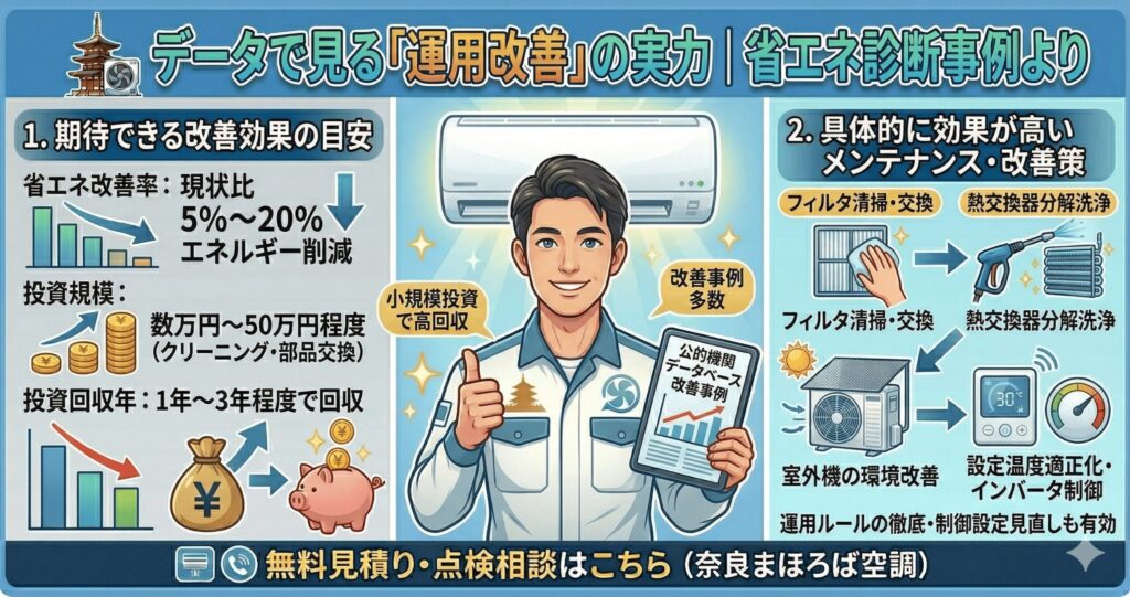 本記事では、奈良まほろば空調が、公的な省エネ診断事例などのデータを踏まえ、今ある設備を活かした現実的な省エネ対策について解説します。