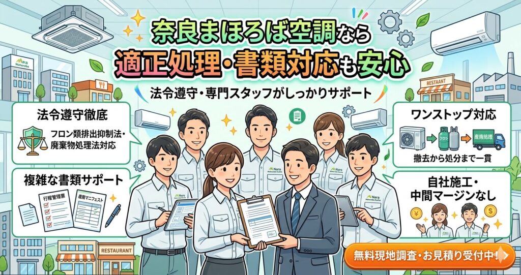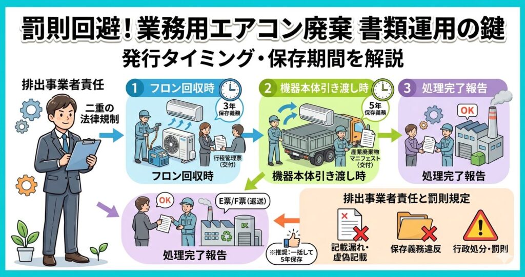 二重の法律による規制を理解し、撤去工事からフロン回収、本体処分までの各段階で正しく書類を運用・保存することが、罰則回避の鍵となります。
