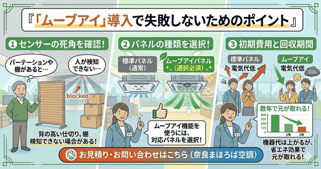 奈良まほろば空調 | 創業50年・奈良密着の空調設備 > 奈良のエアコンお役立ち情報 > 省エネコンサルティング > 三菱「ムーブアイ」で業務用エアコンの快適性・省エネを最大化|機能と導入メリット