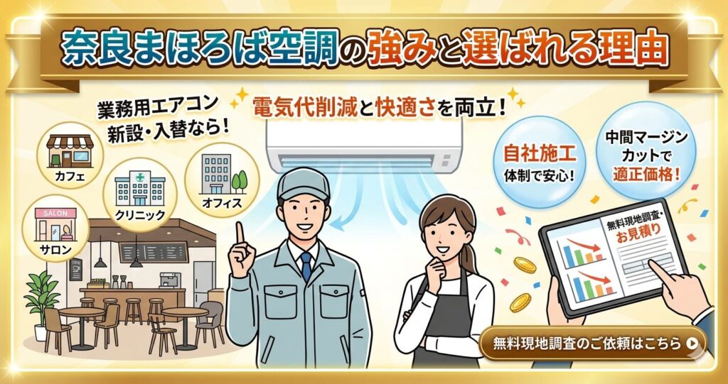 関西エリアで業務用エアコンの新設・入替をご検討なら、当社「奈良まほろば空調」にお任せください。