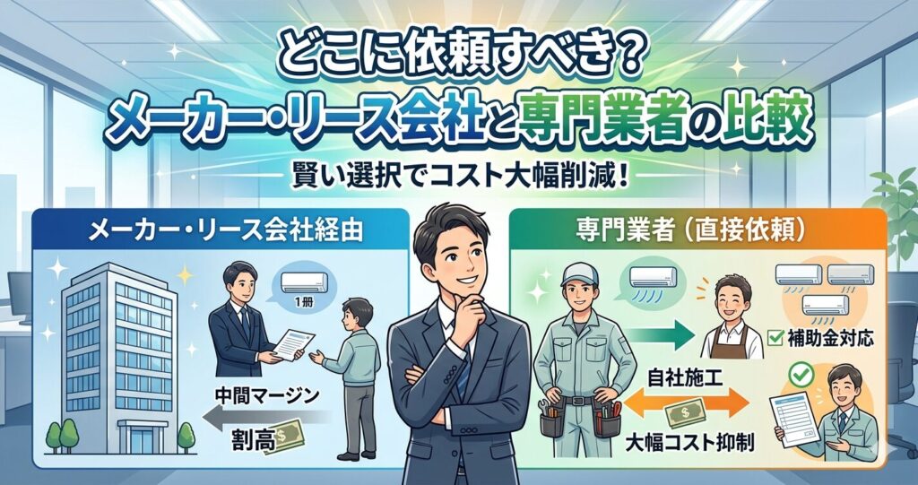 | 比較項目 | メーカー・リース会社経由 | 業務用エアコン専門業者(当社など) |
