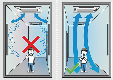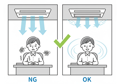 冷房時に、人が風の冷たさを感じにくいように、風を水平方向に吹き出す機能です。特に、エアコンの真下にデスクや客席がある場合に、不快な風当たり(ドラフト感)を大幅に軽減します。