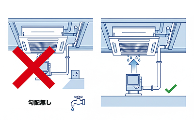 室内機で発生した排水(ドレン)を、最大60cm〜85cm程度の高さまで持ち上げることができるドレンアップメカを標準で搭載しているモデルが主流です。これにより、天井裏の勾配が取りにくい場所でも、スムーズな排水経路を確保しやすくなります。