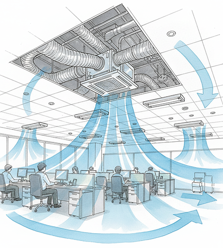 強力なエアコン本体を天井裏などの目立たない場所に設置し、そこからダクト(風の通り道)を建物内に張り巡らせることで、あらゆる空間に自由自在に快適な空気を届ける。