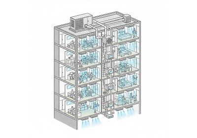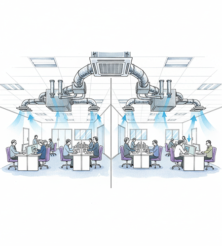 一台の強力な室外機・室内機で、複数の部屋や広大なフロアをまとめて空調管理できます。ホテルや病院の各客室、オフィスの各会議室などを、効率よく、そして一括で管理したい場合に最適です。それぞれの吹出口で風量を調整することで、建物全体の快適性を高いレベルで均一に保ちます。