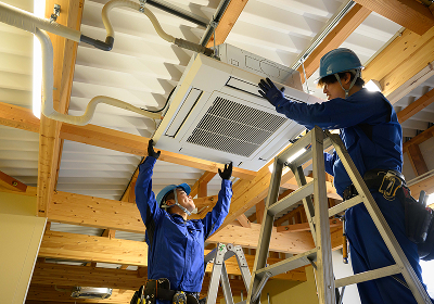 天井から直接機器を吊り下げるため、その重量を長期間、安全に支えるための十分な天井強度が必要です。設置前には、必ず下地の状況を確認し、必要であれば補強工事を行います。