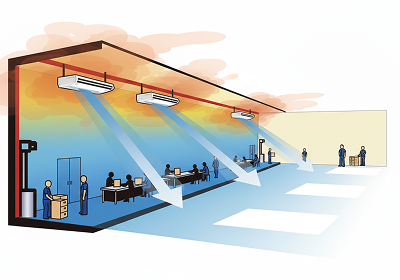 天井吊形の最大の特長は、強力なファンで、狙った方向へまっすぐ遠くまで風を送れることです。天井が高い工場や倉庫、奥行きのある店舗や教室でも、部屋の奥までしっかりと快適な空気を届け、空間全体の温度ムラを解消します。